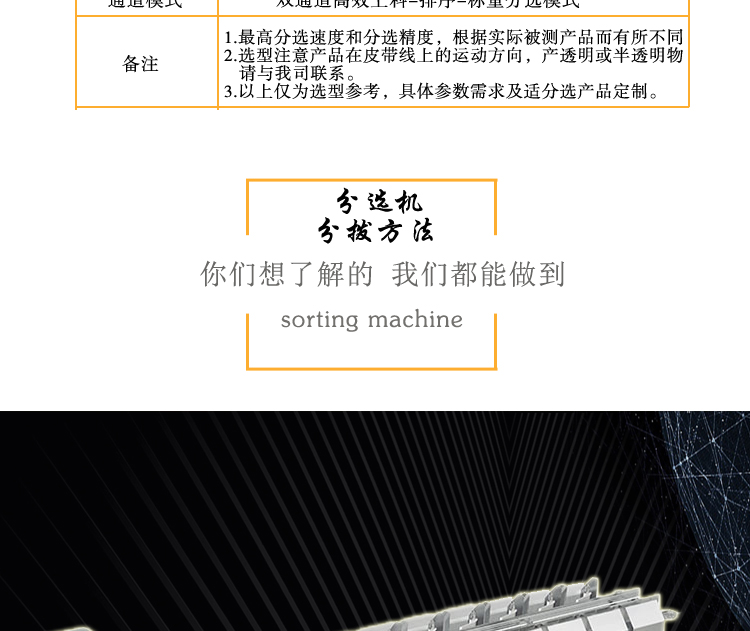 3、以上僅為選參考,具體參數(shù)需求及適合分選產(chǎn)品根據(jù)用戶實(shí)際需求定制