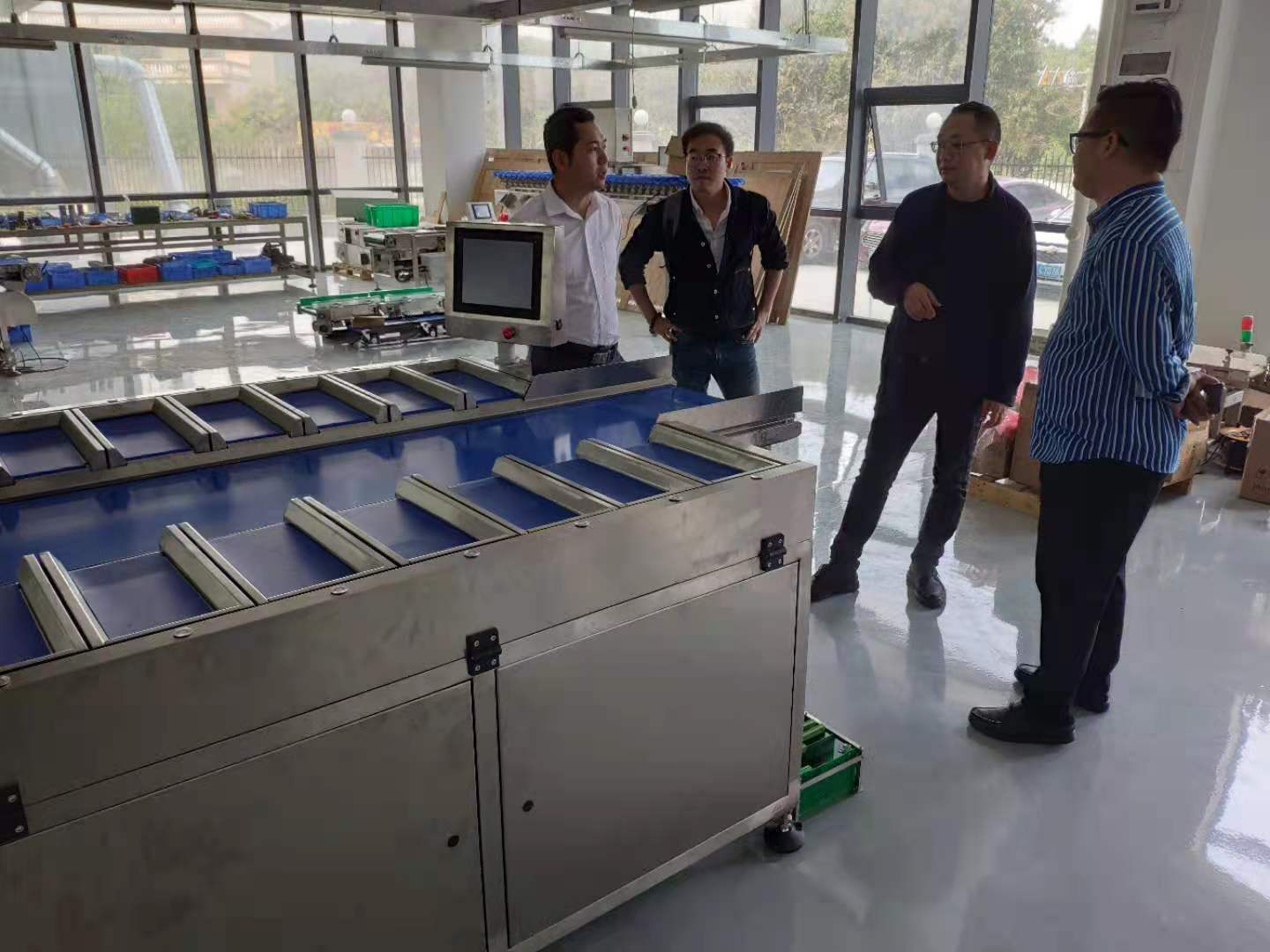經(jīng)過(guò)自動(dòng)配重秤時(shí),梁秘打量了下,問(wèn)這大塊頭這么多個(gè)分區(qū)是有什么用途呢?李總說(shuō),“這是我司這幾年研發(fā)設(shè)計(jì)的DHPZ系列配重秤,在預(yù)包裝過(guò)程中,用于產(chǎn)品按目標(biāo)重量、數(shù)量組合出料的設(shè)備,一般和包裝機(jī)做配套,多應(yīng)用于果蔬生鮮、水產(chǎn)、禽肉、休閑零食等行業(yè)。”梁秘表示,用途很廣泛,想不到這設(shè)備有這么重要的作用。