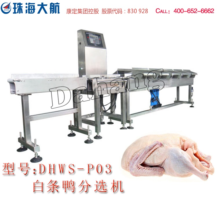 珠海大航白條鴨分級(jí)稱,是一種高速度、高精度的在線稱重設(shè)備,主要用于各種自動(dòng)化流水線上的動(dòng)態(tài)稱重,以及重量自動(dòng)分級(jí)。